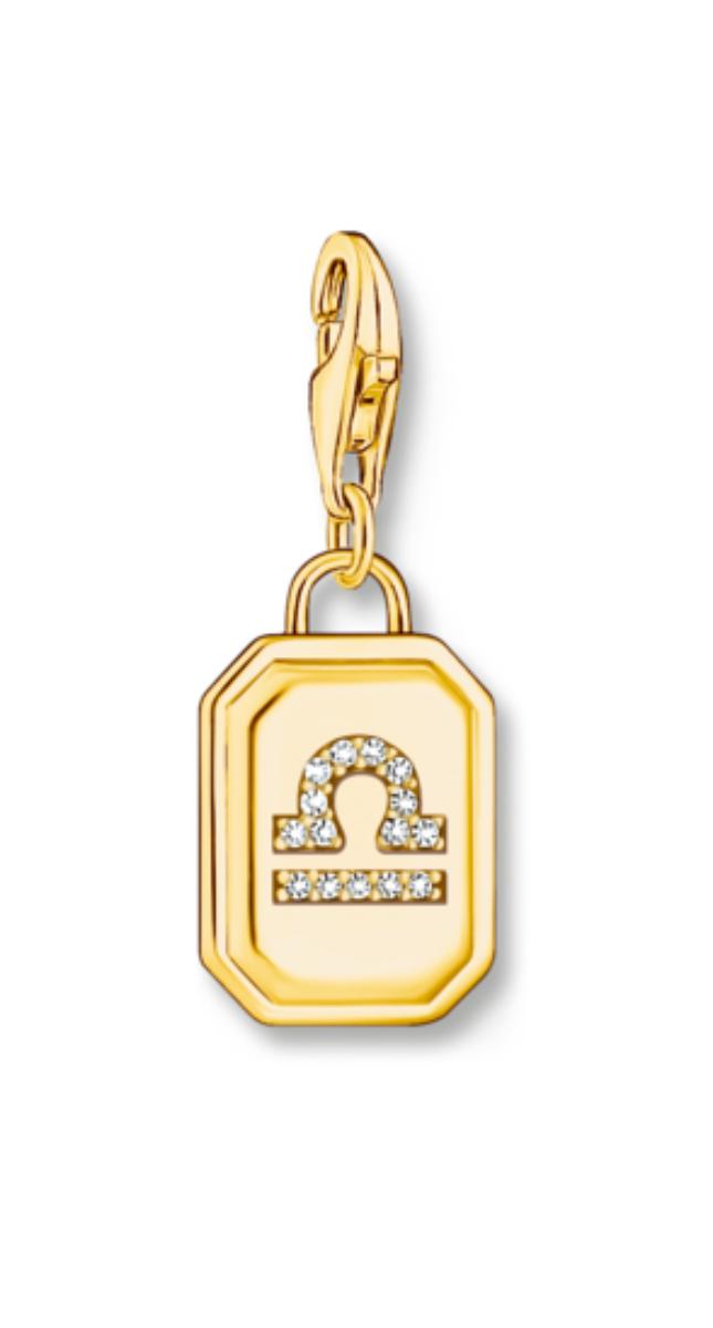 Thomas Sabo Charm Club Charmista vaaka helaa 2153-414-39 koristaa vaa'an tähtimerkki. Horoskooppikoru on kooltaan 26 mm, ja se on valmistettu 18-karaatin kullatusta sterling-hopeasta.