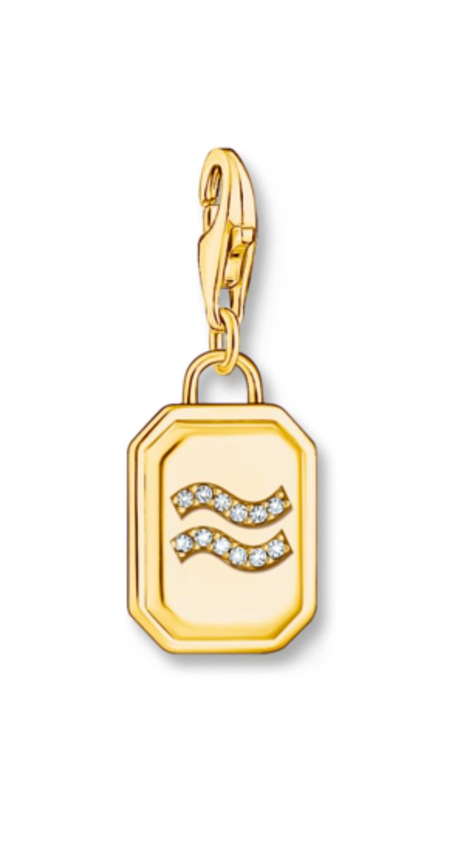 Thomas Sabo Charm Club Charmista vesimies helaa 2155-414-39 koristaa vesimiehen tähtimerkki. Horoskooppikoru on kooltaan 26 mm, ja se on valmistettu 18-karaatin kullatusta sterling-hopeasta.