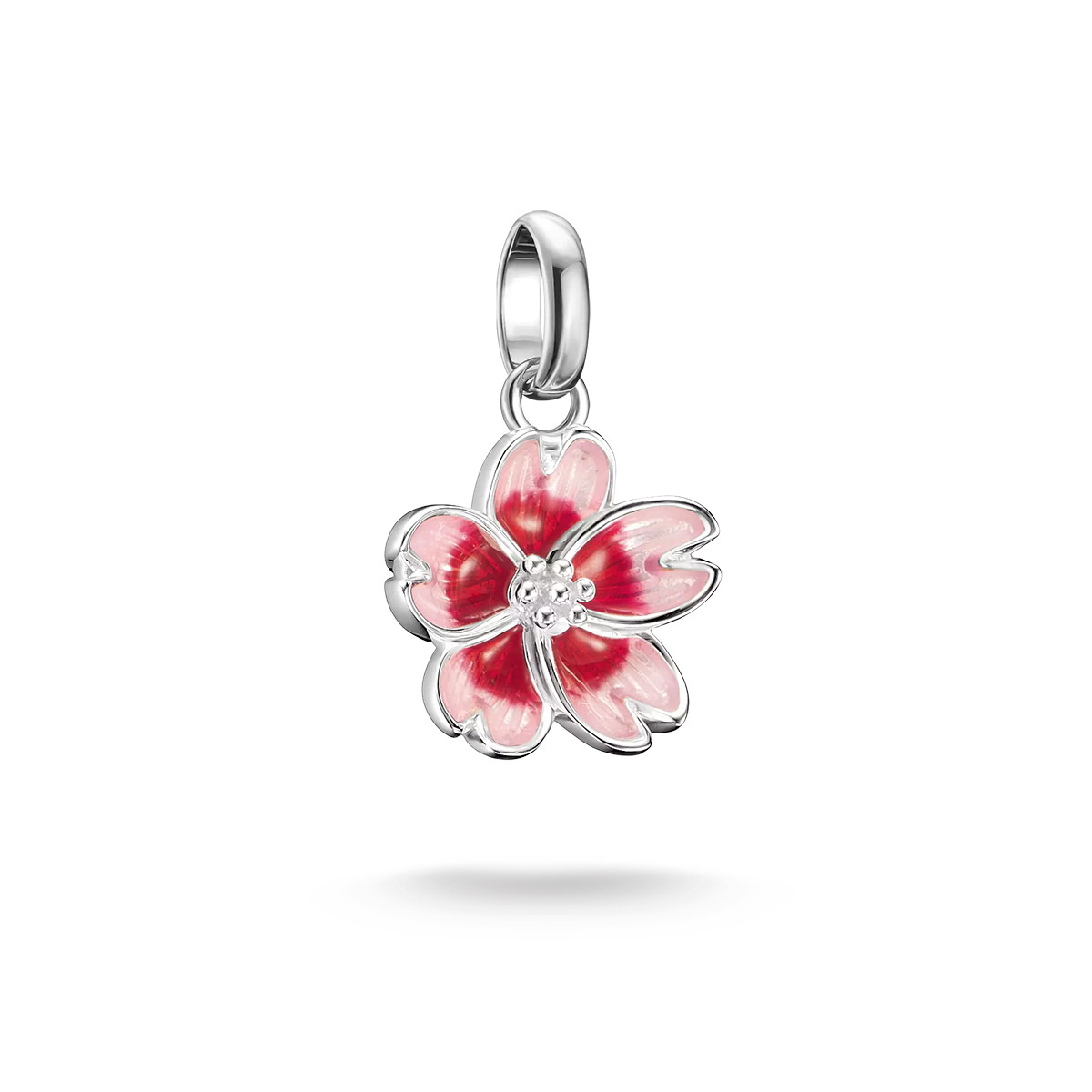 Tämä herkkä Thomas Sabo Charm Club Connect Tokyo Crush kirsikankukka-hela tuo kukkivan kevään ja japanilaista sakuura-runollisuutta koruusi. 925-sterling-hopeasta valmistettu ja käsinmaalatulla vaaleanpunaisella emalilla viimeistelty kukka symboloi kauneutta sekä uusia alkuja. Noin 20,5 mm korkea ja 13 mm leveä riipus kiinnittyy lenkillä, tuoden romanttista ja feminiinistä tyyliä rannekoruusi tai kaulaketjuusi. Se on täydellinen muistutus elämän arvokkaista ja katoavista hetkistä.