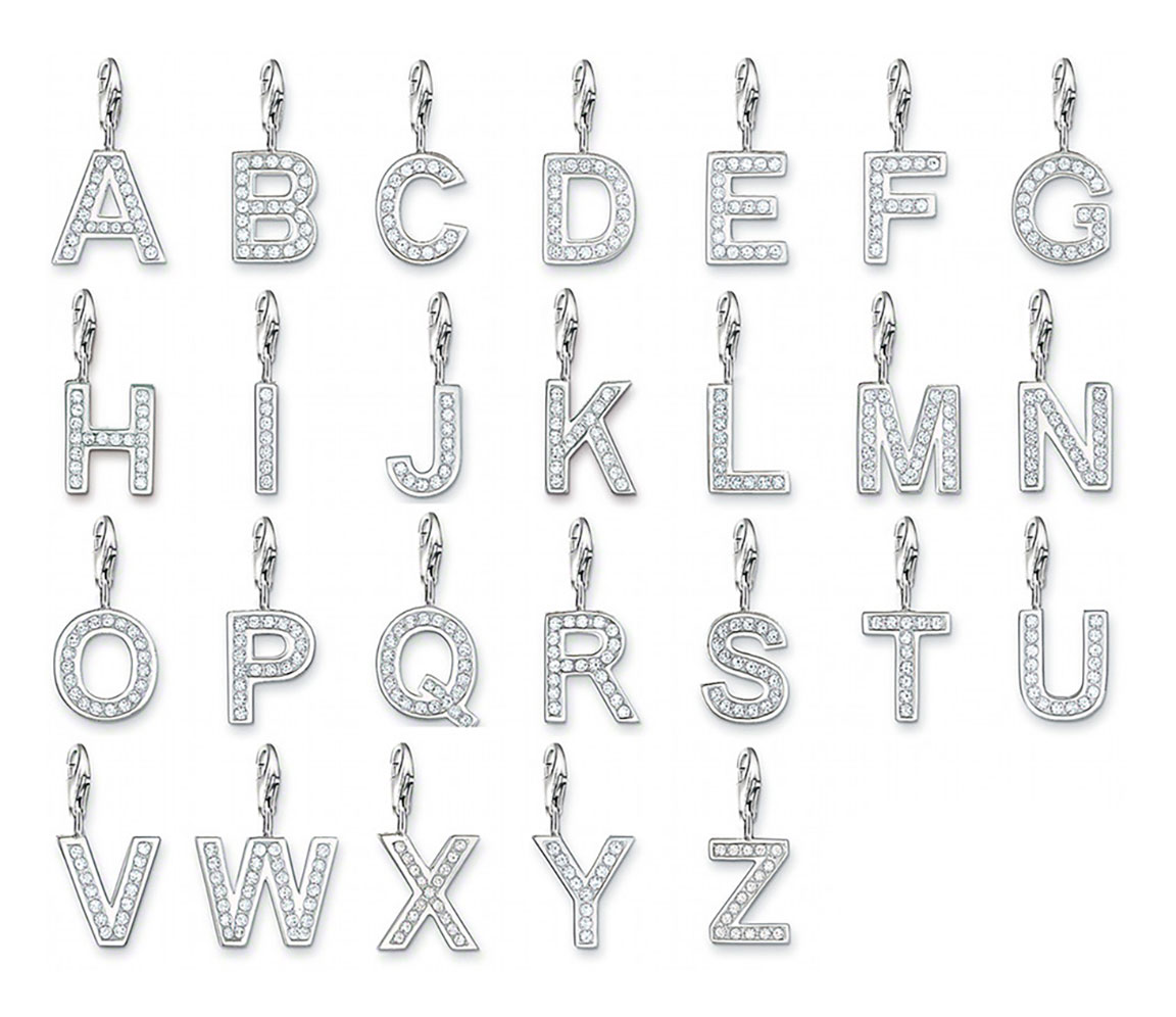 Thomas Sabo Charm Club synteettisillä zirkonioilla koristellut kirjaimet. Thomas Sabo Charm Club kirjainkorut valmistetaan 925 sterling-hopeasta. Kirjainkorujen pituus on 1,3cm.