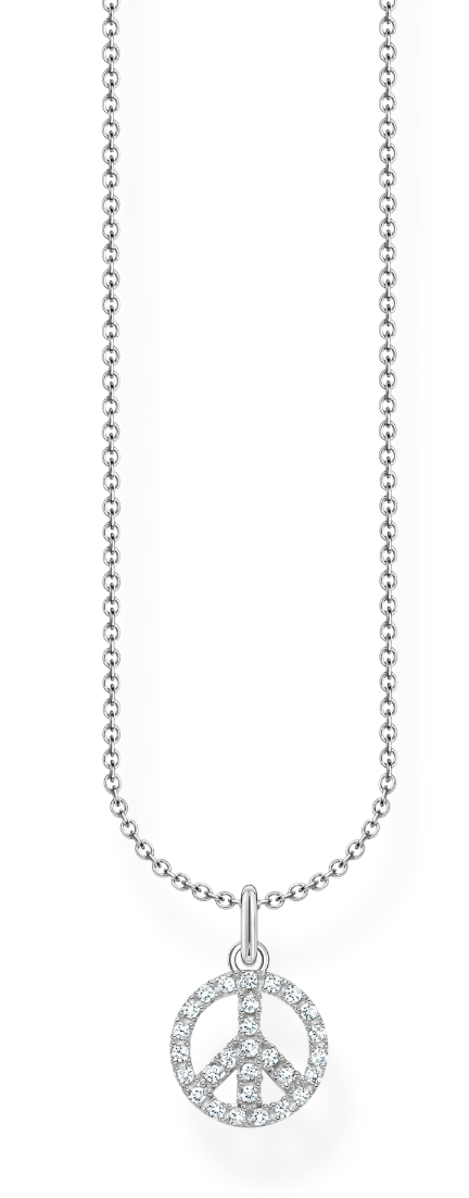 Thomas Sabo Charm Club Charming Peace on uusi korusarja, jonka keskiössä on rauhan symboli. Thomas Sabo Charming Peace with white stones silver kaulakoru KE2175-051-14-L45V-kaulakoru on koristeltu kirkkain synteettisin zirkonioin. Riipuksen koko on 14 x 9 mm, ja ketjun pituus on säädettävissä välille 40-45 cm. Thomas Sabo-korut toimitetaan valmistajan alkuperäisessä pakkauksessa.