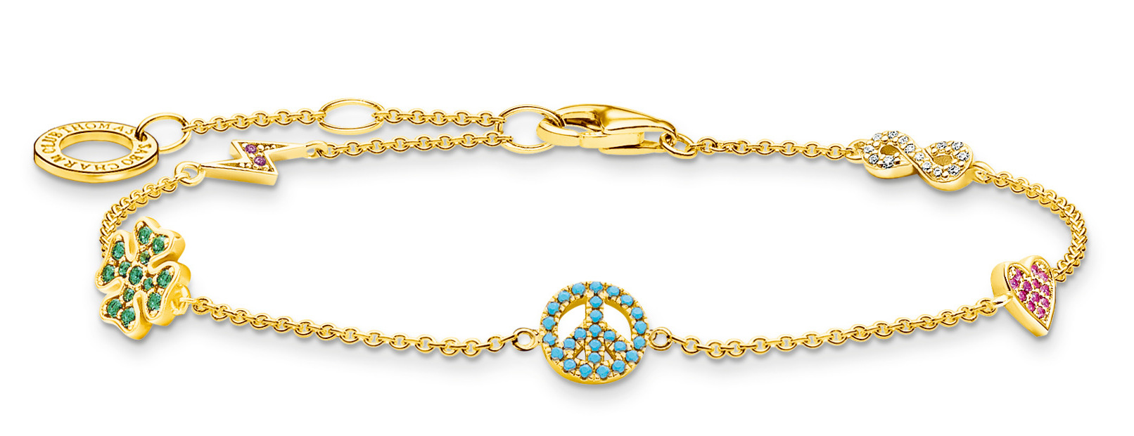 Thomas Sabo Charming Symbols gold A2039-488-7-L19V -rannekorua koristaa kauniit onnen, rauhan ja rakkauden symbolit, jotka tuovat hyvää tuulta kantajalleen. Korun pinta on koristeltu erivärisin synteettisin kivin ja kristallein ja 18-karaatin kultauksella. Ketjun pituus on säädettävissä 16-19 cm välille. Thomas Sabo-korut toimitetaan valmistajan alkuperäisessä rasiassa.