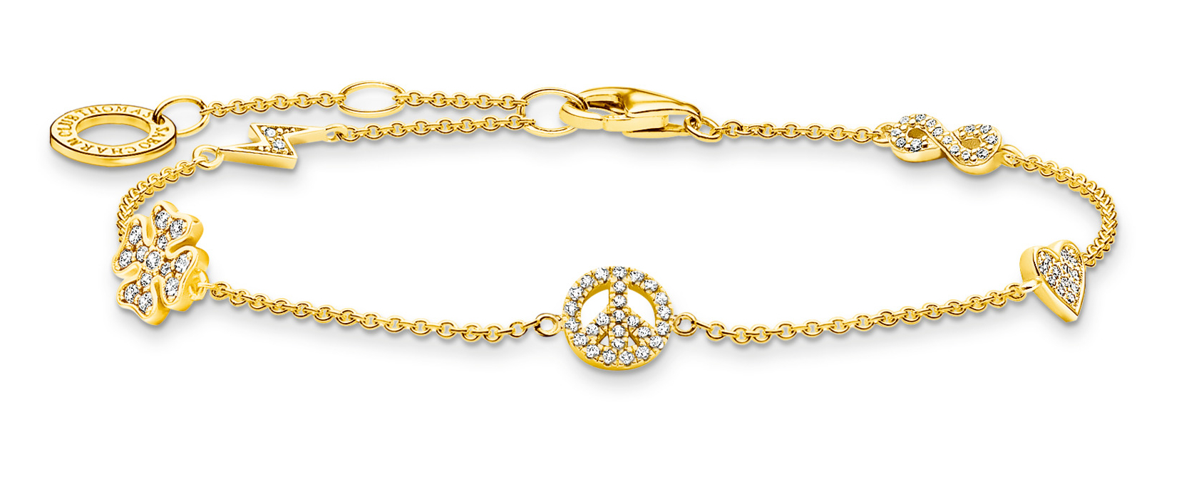 Thomas Sabo Charming Symbols gold B15A2039-414-14-L19V -rannekorua koristaa kauniit onnen, rauhan ja rakkauden symbolit, jotka tuovat hyvää tuulta kantajalleen. Korun pinta on koristeltu kirkkain zirkonioin ja 18-karaatin kultauksella. Ketjun pituus on säädettävissä 16-19 cm välille. Thomas Sabo-korut toimitetaan valmistajan alkuperäisessä rasiassa.