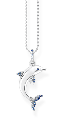 Thomas Sabo dolphin with blue stones halsband KE2144-644-1-L45V meriteemaista kaulakorua koristaa delfiini ja moniväriset synteettiset korukivet ja kristallit. Riipuksen koko 33 x 7 mm, ja ketju on säädettävissä 40-45 cm pituuteen. Thomas Sabo korut toimitetaan valmistajan alkuperäisessä pakkauksessa.
