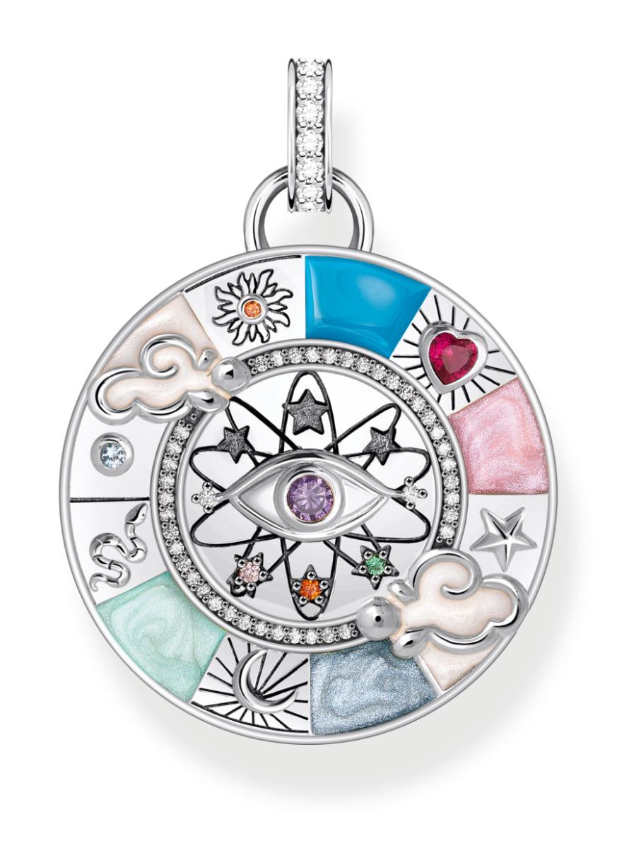 Thomas Sabo Glam & Soul Cosmic Amulet wheel of fortune silver riipus PE962-340-7 joka rohkaisee unelmoimaan. Koru on koristeltu värikkäällä emalilla, punaisilla korundeilla ja synteettisillä zirkonioilla. Takaa löytyy teksti "Make a wish". Koru on sterling-hopeaa, ja sen koko on 29 x 40 mm. Ketju myydään erikseen. Thomas Sabo-korut toimitetaan valmistajan alkuperäisessä pakkauksessa.