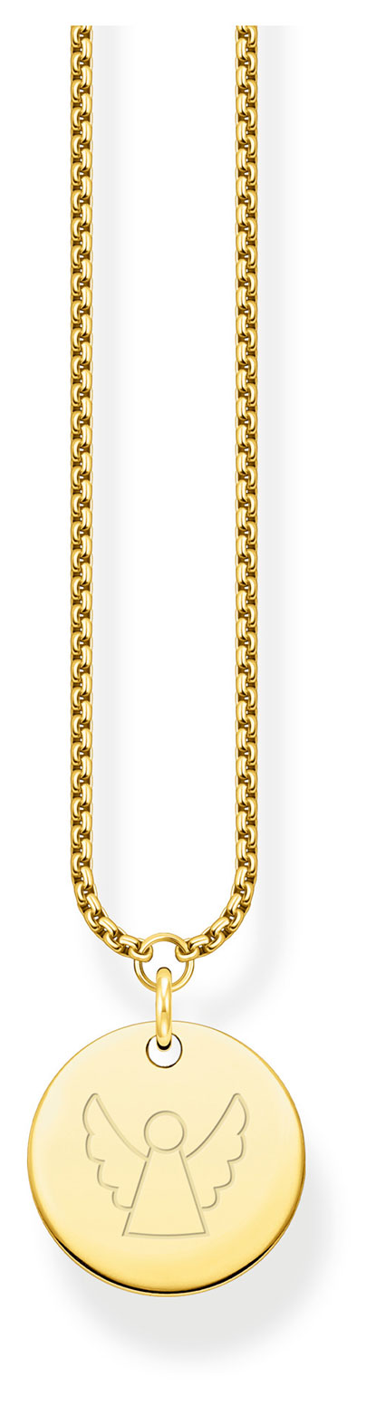 Thomas Sabo Glam & Soul Gold KE1958-413-39 on kaunis papuketjulla varustettu kullanvärinen kaulakoru, joka käy juhliin sekä arkikäyttöön. Ketju on pituudeltaan säädettävissä 40 - 45 cm väliltä. Kaulakorussa on pyöreä muotoilu, jonka kääntöpuolella on enkeli-kaiverrus. Koru on leveydeltään 13 mm. Kaulakorun materiaali on 18-karaatin kullalla pinnoitettu 925 Sterling-hopea.