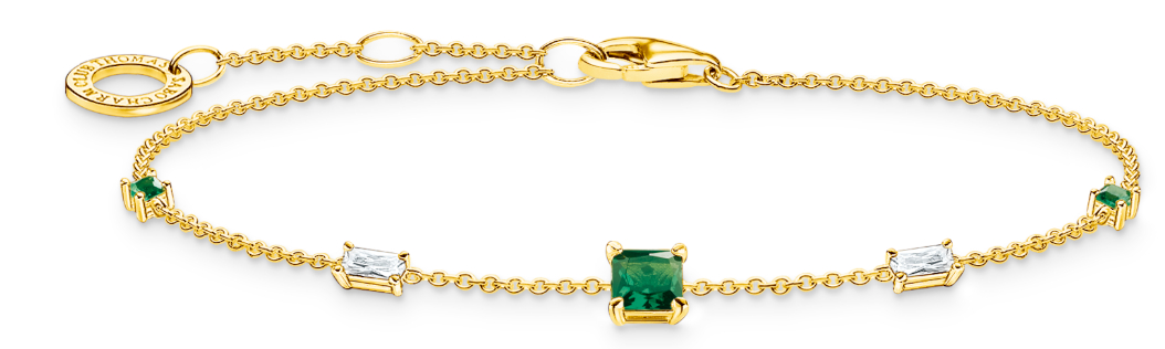 Thomas Sabo green and white stones gold rannekoru A2059-971-7-L19V kuuluu Thomas Sabo Charming Emerald-sarjaan, ja korua koristaa ylelliset valkoiset synteettiset zirkoniat ja vihreät korukivet. Korun ilme on viimeistelty 18-karaatin kultauksella. Ketjun pituus on säädettävissä välille 16-19 cm. Thomas Sabo-korut toimitetaan valmistajan alkuperäisessä pakkauksessa.