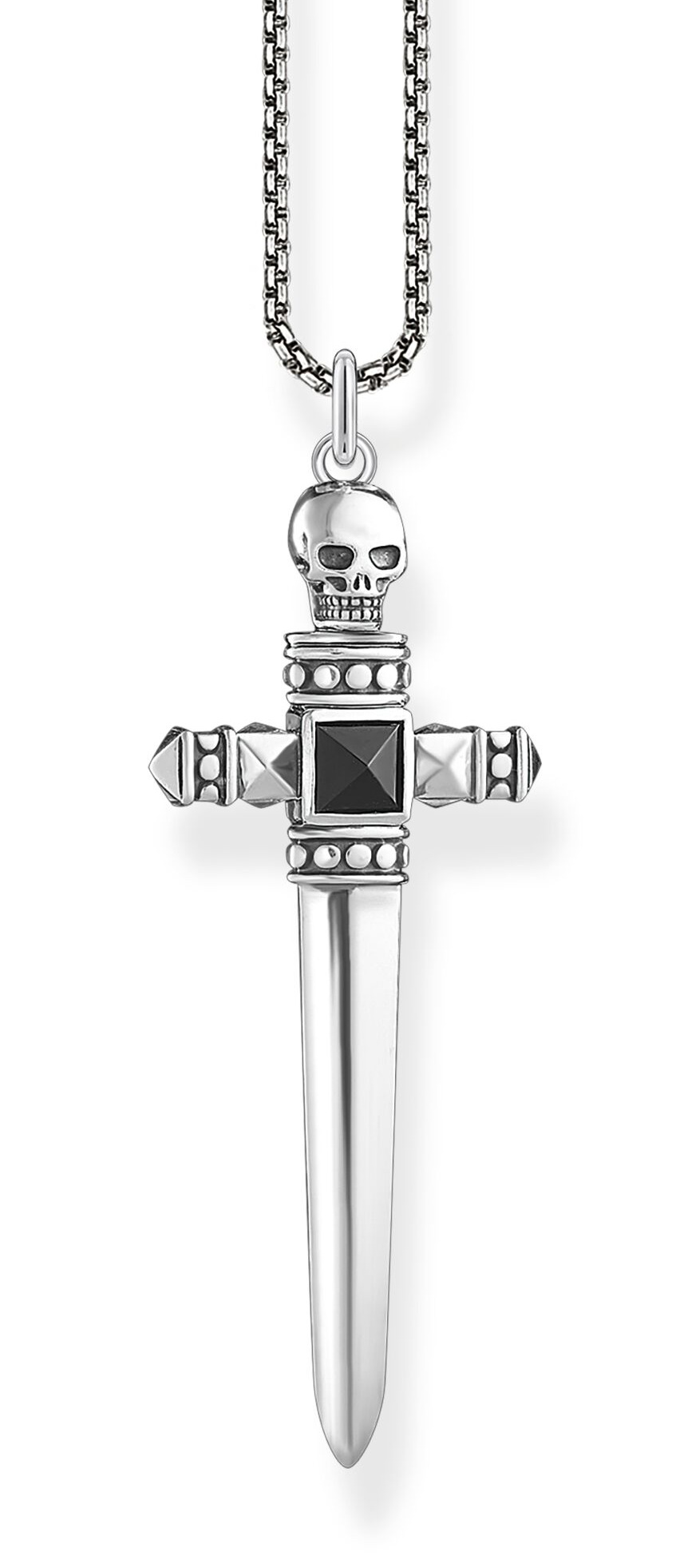 Thomas Sabo sword KE1999-507-11-L50V-miekkakaukaloru on tarkoitettu rohkeille kapinallisille. Sterling-hopeisen miekan pinta on hiottu kolmikulmaiseksi ja viimeistelty pääkallokuviolla ja mustalla onykseillä. Ketjun pituus on säädettävissä 45-50 cm pituuteen, ja riipuksen pituus on 5,1 cm. Thomas Sabo-korut toimitetaan valmistajan alkuperäisessä pakkauksessa.