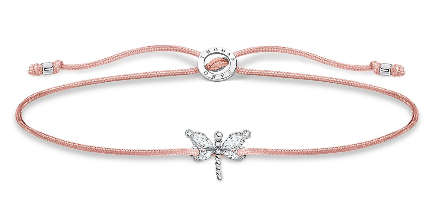 Thomas Sabo filigraani rannekoru butterfly white stone LS118-401-19-L20V muistuttaa kesästä, ja siinä on ohut vaaleanpunainen nailonranneke ja suurin zirkonioin koristeltu sterling-hopeinen perhonen. Rannekorun koko on säädettävissä 13-20 cm pituuteen, ja korun leveys on 1,10 cm. Thomas Sabo-korut toimitetaan valmistajan alkuperäisessä rasiassa.