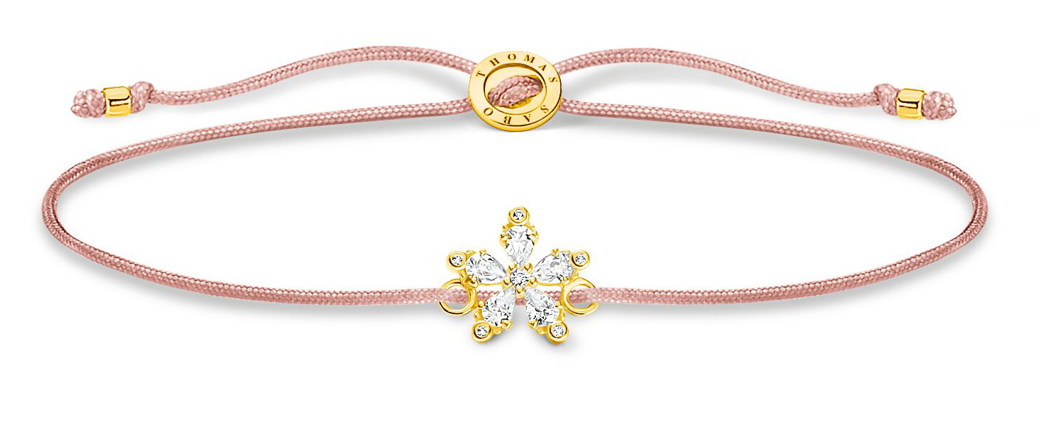 Thomas Sabo flower white stones LS119-379-19-L20V-rannekorussa on kaunis 18-karaatin keltakullalla pinnoitettu sterling-hopeinen kukka, jonka pintaa on istutettu useita pisara- ja briljanttihiottuja kirkkaita zirkonioita. Nyöri on vaaleanpunaista nylonia, ja rannekoru on säädettävissä 13-20 cm pituuteen. Korun leveys on 1 cm. Thomas Sabo-korut toimitetaan valmistajan alkuperäisessä rasiassa.