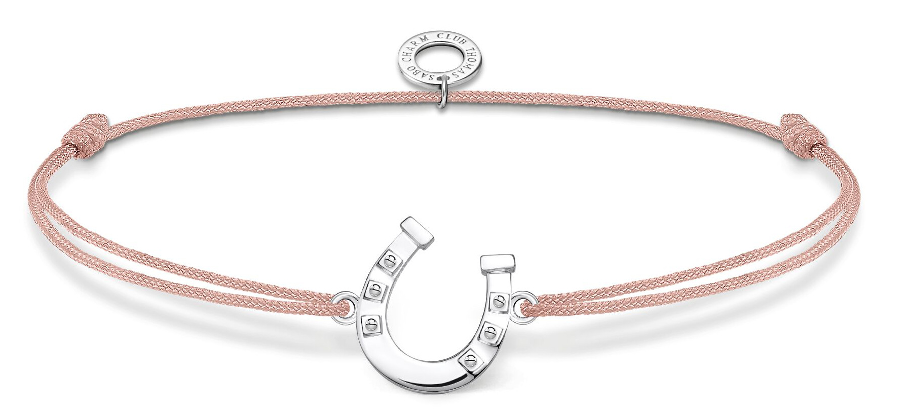 Thomas Sabo rannekoru horseshoe LS124-173-19-L20V tuo onnea kantajalleen. Tämä rannekoru on valmistettu vaaleanpunaisesta nylonista ja koru on sterling-hopeaa. Ranneke on säädettävissä 14-20 cm pituuteen, ja hevosenkengön leveys on 1,3 cm. Thomas Sabo-korut toimitetaan valmistajan alkuperäisessä pakkauksessa.