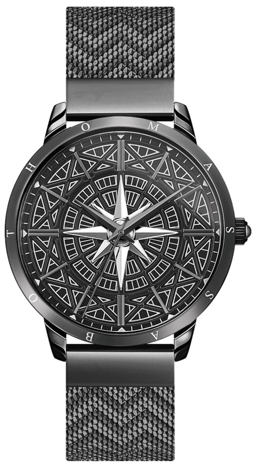Thomas Sabo Spirit Cosmos compass black WA0374-202-203-42 MM-miesten rannekello on saanut inspiraationsa kompassista ja 41 mm leveää kellotalua koristaa kolmiuloitteinen tähtikuvio. Kaksiväriset ilmeen viimeistelee kaksivärinen, helposti säädettävä, 20 mm leveä mesh-ranneke, joka on miellyttävät kevyt ranteessa. Kellon paksuus on vain 9,8 mm, ja rannekkeen leveys on 20 mm. Koneistona toimii Miyota GL32.
