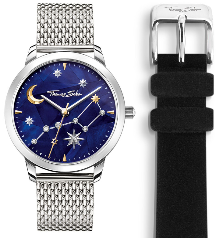 Thomas Sabo Spirit Cosmos starry sky silver SET_WA0372-217-209-33 MM-rannekkellossa on kuvattu universumin kauneus. Kellotauluna toimii aito helmiäinen, joka on värjätty siniseksi luomaan yönsinisen vaikutelman. Kellotaulun keskellä on kuvattu otava. Erikokoiset kirkkaat zirkoniat imitoivat oikeita tähtiä ja tuovat tämän kellon kantajalle onnea. Rungon leveys on 33 mm, paksuus 9 mm, koneistona toimii Japanilainen Miyota GL32. Pakkaus sisältää sekä teräksisen mesh-rannekkeen että mustan samettipintaisen nahkarannekkeen, jotka on helppo vaihtaa kotona tyylin muuttamiseksi.