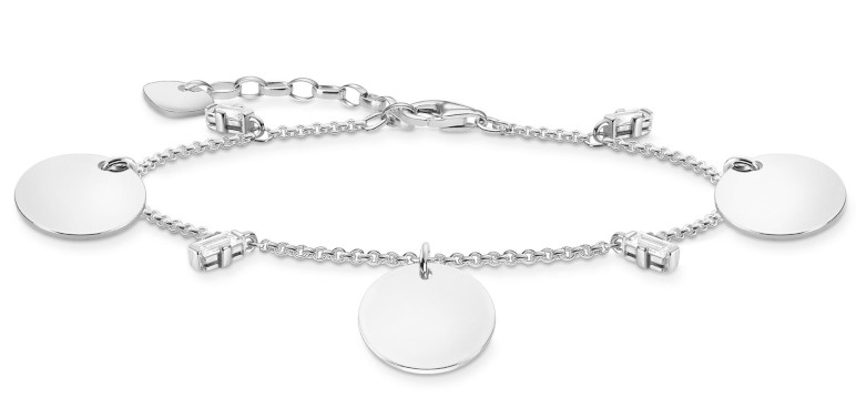 Thomas Sabo wih three discs and white stones hopea A1962-051-21-L19V-rannekorusta on helppo luoda lempikoru itselle tai lahjaksi. Rannekorussa on kolme sileää, pyöreää laattaa, joihon on mahdollista kaivertaa henkilökohtainen viesti, nimi tai päivämäärä. Valitse ensin kaiverrus ja kaiverruksessa käytettävä tekstityyli ja kirjoita kaiverrettavat tiedot "kaiverrettava teksti" -kenttään (maks. 10 merkkiä per laatta). Koru on valmistettu sterling-hopeasta, ja koristeltu useilla baquette-hiotuilla zirkonioilla. Ketjun pituus on säädettävissä 16-19 cm pituuteen. Thomas Sabo-korut toimitetaan valmistajan alkuperäisessä pakkauksessa.