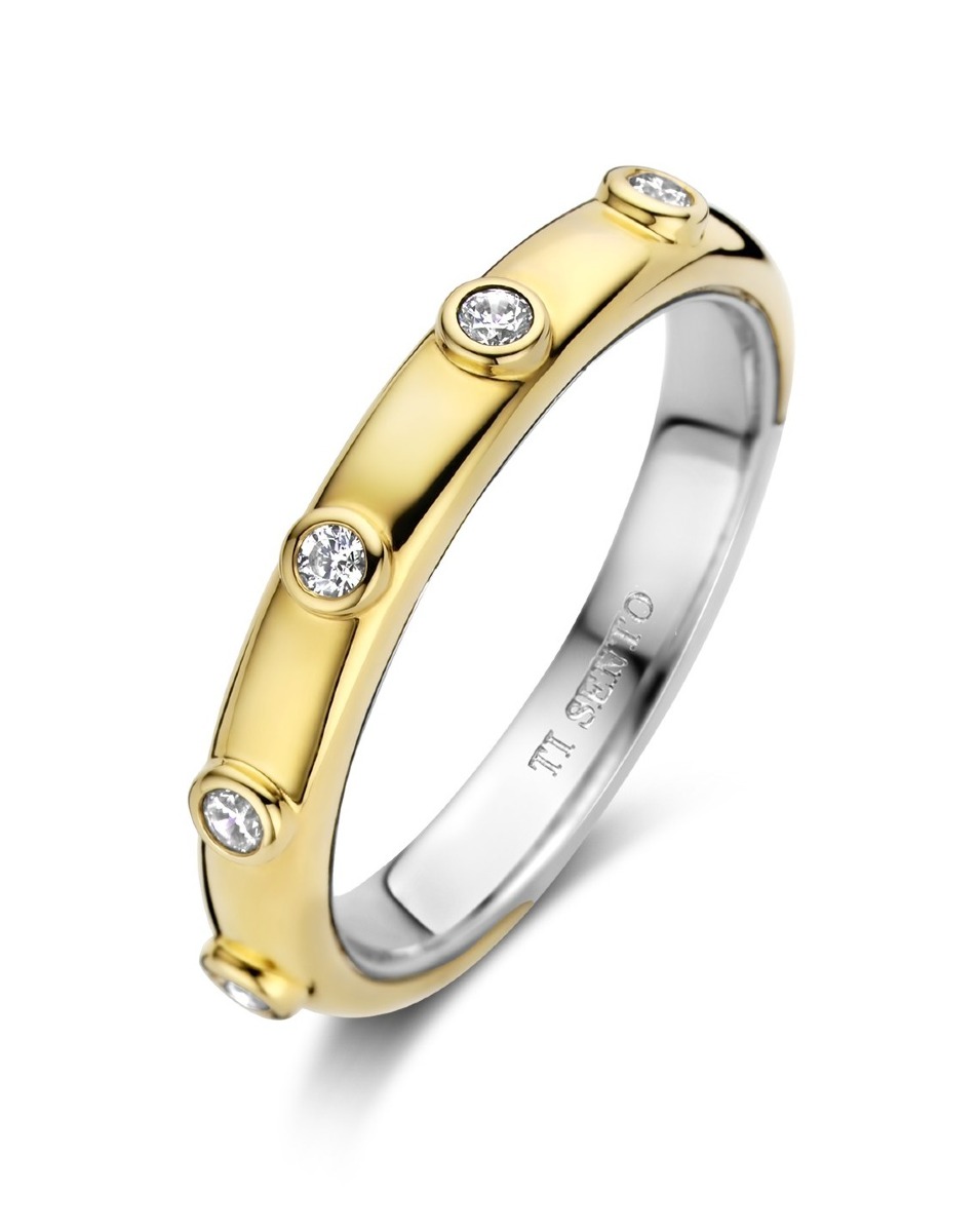 TI SENTO Golden hour kullattu hopeasormus 12316ZY pintaan on istutettu useita briljanttihiottuja synteettisiä zirkonioita. Rivisormuksen pinta on viimeistelty aidolla keltakullalla. Sormuksen koko kivien kohdalta on 3 mm, ja rungon leveys takaa on 2 mm. TI SENTO -korut toimitetaan valmistajan alkuperäisessä rasiassa, ja niillä on 2 vuoden takuu, joka kattaa valmistus- ja materiaalivirheet.