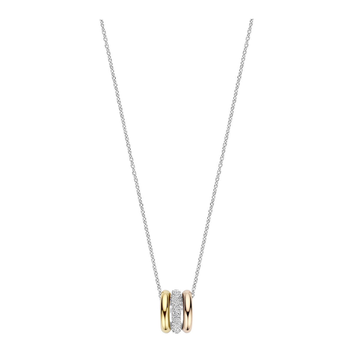 TI SENTO 34128TZ -kaulakorussa yhdistyvät kauniisti kolme eri metallinsävyä; hopea, kulta ja ruusukullan väriset elementit. Yksi renkaista on koristeltu säihkyvillä zirkoniakivillä, jotka tuovat koruun upeaa kimallusta. Kolmivärinen muotoilu tekee kaulakorusta monipuolisen ja helposti yhdisteltävän eri korujen ja tyylien kanssa. Riipus liikkuu kevyesti sirossa hopeansävyisessä ketjussa, mikä antaa korulle elegantin ja kevyen ilmeen. Ketjun säädettävä pituus 38-48 cm. Riipuksen leveys 9 mm ja pituus 11 mm.