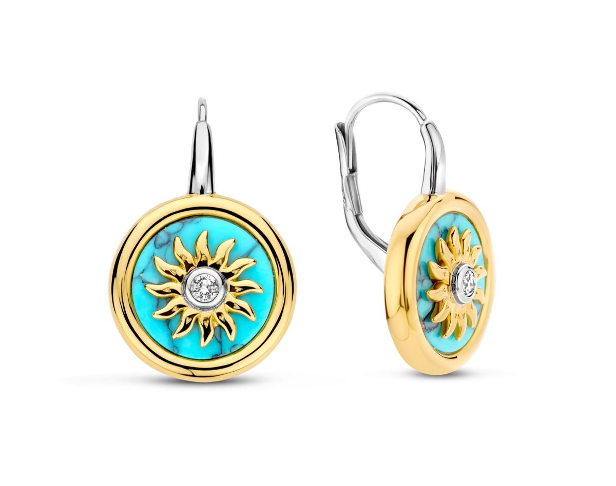 TI SENTO kolikkokorvakorut turkoosilla 7971TQ ovat täydellinen boheemiin tyyliin. Nämä värikkäät koukkokovakorut on viimeistelty synteettisillä turkoosilla ja kirkkailla zirkonioilla. Kolikkoa koristaa aurinko. Koukkukorvakorujen koko on 16 x 25 mm. Kevyen koukun avulla korut on helppo pukea ja ne tuntuvat kevyeltä yllä. Kokonaisuuden viimeistelee aito keltakultaus. TI SENTO-korut valmistetaan sterling-hopeasta, ja toimitetaan kotiin valmistajan kauniissa korurasiassa. TI SENTO -koruilla on 2 vuoden takuu, joka kattaa valmistus- ja materiaalivirheet.