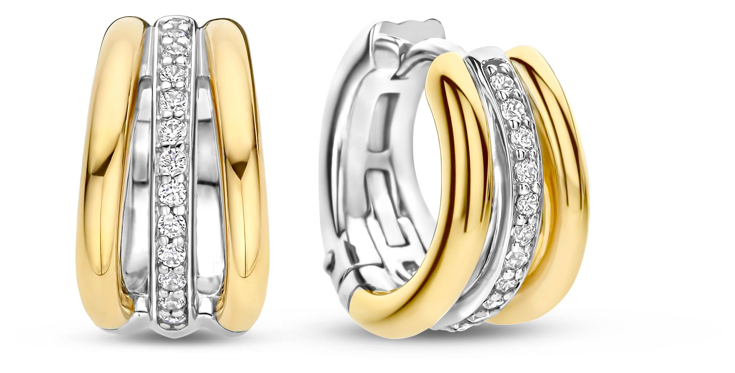 TI SENTO 78010ZY kullatut korvakorut ovat valmistettu ensiluokkaisesta 925 sterling-hopeasta ja niissä on silmiinpistävä kolminkertainen muotoilu – kaksi tyylikästä keltakullattua rengasta, jotka ympäröivät platinapinnoitettua keskirengasta, joka on koristeltu pavé-istutetuilla zirkonioilla. Tämä ainutlaatuinen rakenne luo kerrostetun, mittasuhteisen vaikutelman, mikä tekee näistä korvakoruista tosi erottuvat. Nikkelittömät ja hypoallergeeniset korvakorut takaavat ylellisen mukavuuden jokaisessa käytössä. Korvakorujen pituus 13 mm ja korun leveys 14 mm.