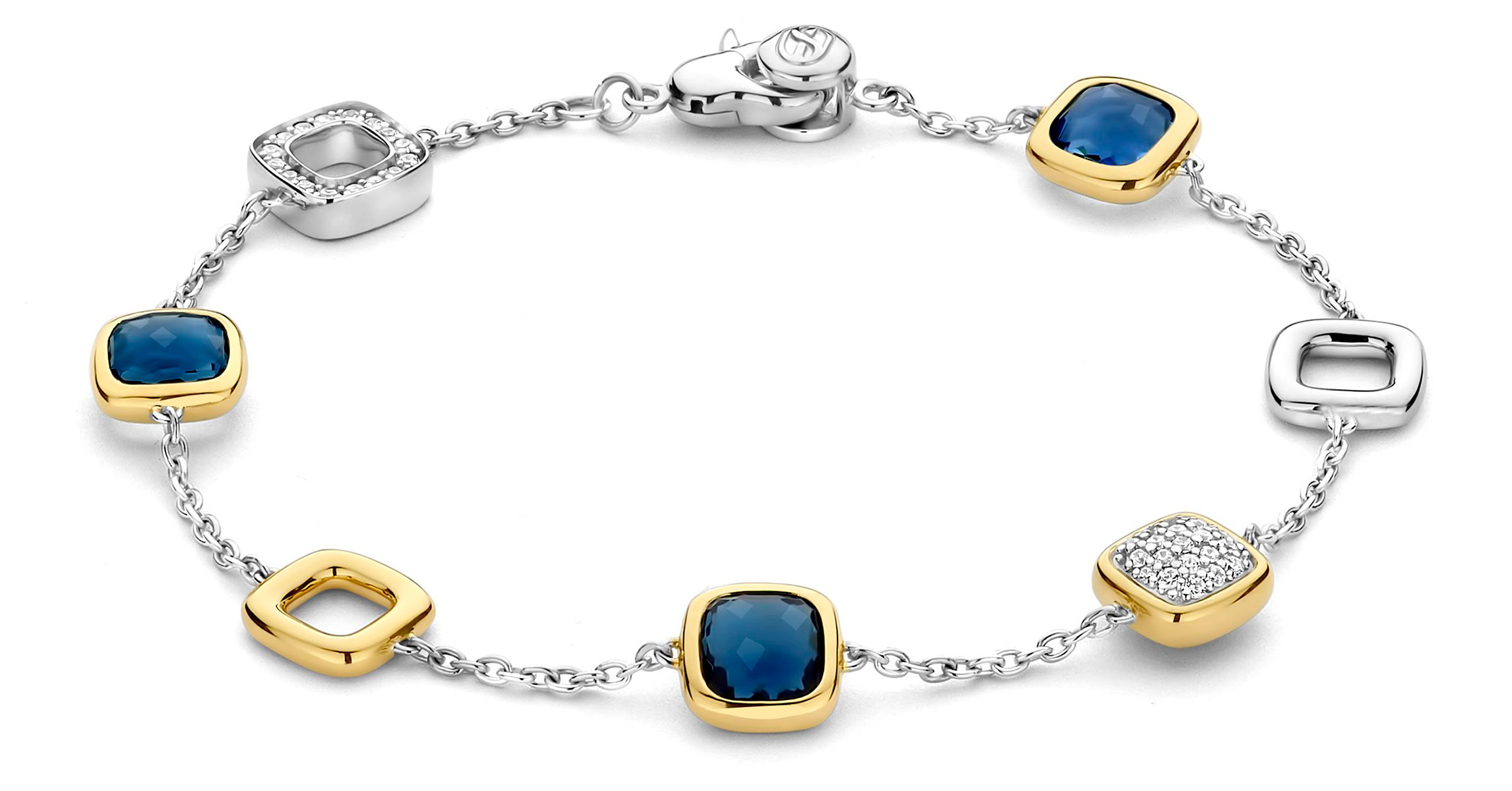 TI SENTO 23080DB rannekoru on ammattitaidolla valmistettu laadukkaasta 925 sterling-hopeasta. Rannekorussa on herkkä ketju, joka on koristeltu dynaamisella yhdistelmällä tyynyn muotoisia heloja, joista jokainen tarjoaa ainutlaatuisen viehätyksen. Keltakullalla päällystetyt syvänsiniset kivet tuovat rikkaan, ylellisen kontrastin ja avokehyksiset kullatut linkit lisäävät modernia tyyliä, kun taas pavé-istutetut zirkoniakorostukset luovat hohtavan loiston, joka vangitsee valon jokaisella liikkeellä. Platinapinnoitetut hopeiset linkit viimeistelevät rannekorun ulkonäön - tämä rannekoru on täydellinen yhdistelmä sekä nykyaikaista että ajatonta charmia. Nikkelitön ja hypoallergeeninen rannekoru tarjoaa ylellistä mukavuutta jokaisessa käytössä.