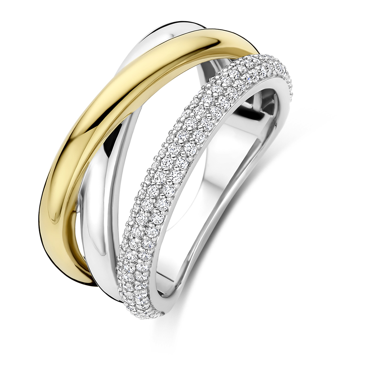 TI SENTO 12422ZY -hopeasormuksen muotoilu muodostuu kolmesta toisiinsa kietoutuvasta renkaasta: kiiltävästä kullansävyisestä, sileästä hopeansävyisestä pinnasta sekä säihkyvillä zirkonioilla koristellusta rivistä. Kirkkaat zirkoniakivet tuovat sormukseen hienostunutta kimallusta ja korostavat sen eleganttia muotoilua ja kaksivärinen ilme tekee korusta helposti yhdisteltävän erilaisten korujen kanssa. Leveys 10 mm ja alta 2,5 mm.
