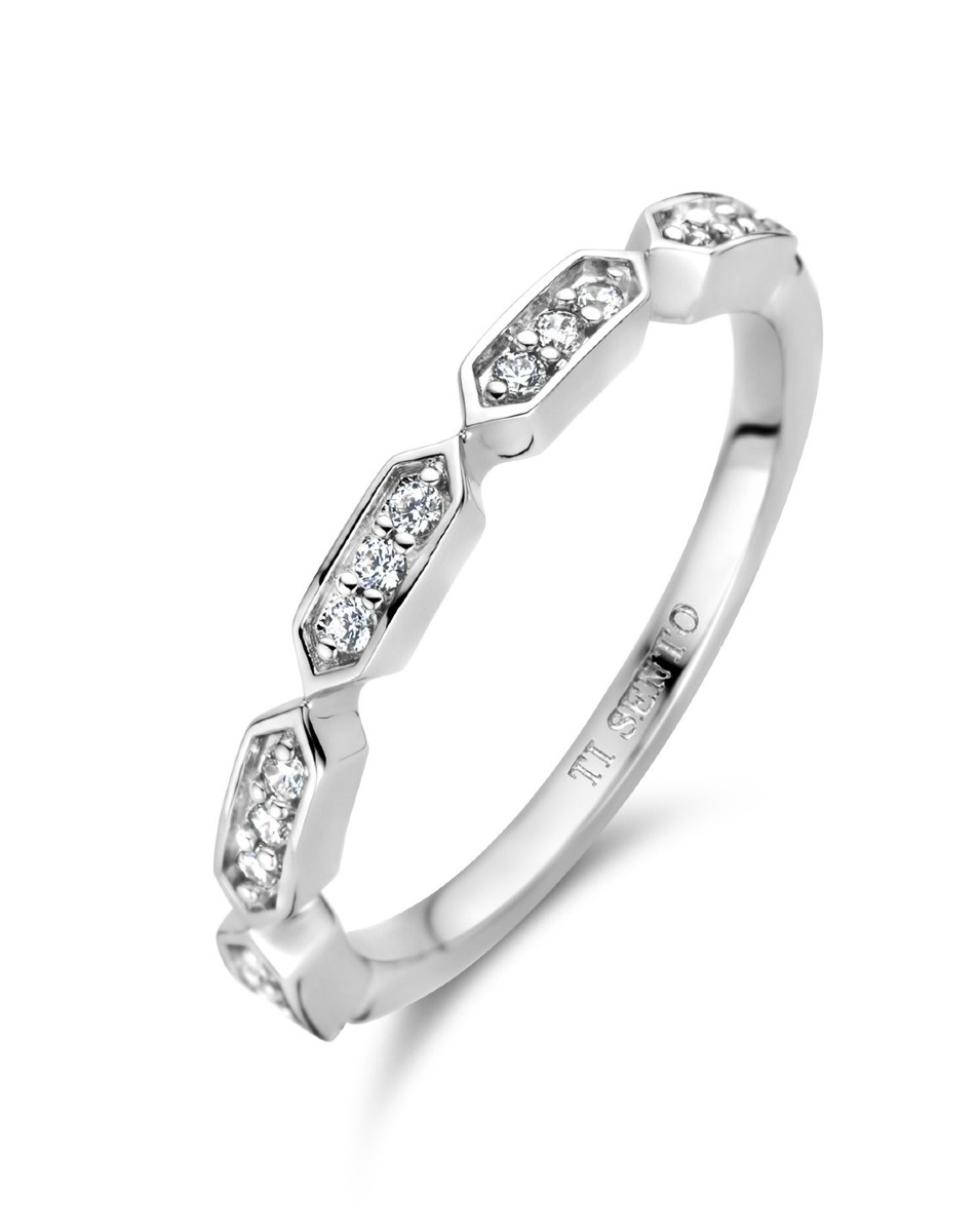 TI SENTO Star light hopea rivisormus 12315ZI sisältää neljä kuusikulmaista riipusta joihon on istutettu useita briljanttihiottuja synteettisiä zirkonioita. Rivisormuksen pinta on viimeistelty platinalla, joka pitää sterling-hopean kiiltävänä pitkään. Sormuksen koko kivien kohdalta on 3 mm, ja rungon leveys takaa on 2 mm. TI SENTO -korut toimitetaan valmistajan alkuperäisessä rasiassa, ja niillä on 2 vuoden takuu, joka kattaa valmistus- ja materiaalivirheet.