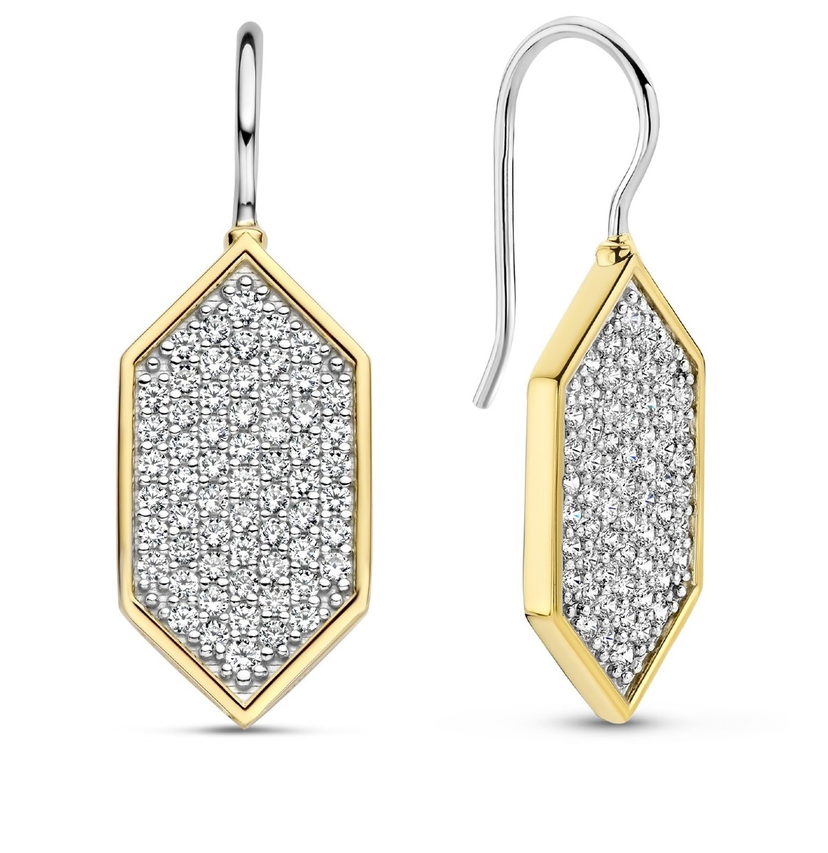 TI SENTO Star light pave korvakorut 7942ZY on koristeltu kuusikulmaisella riipuksella, johon on istutettu useita briljanttihiottuja synteettisiä zirkonioita. Riipuksen reunat on koristeltu aidolla keltakullalla. Korun pinta on viimeistelty platinalla, joka pitää sterling-hopean kiiltävänä pitkään. Korvakorujen koko on 29 x 10 mm. TI SENTO -korut toimitetaan valmistajan alkuperäisessä rasiassa, ja niillä on 2 vuoden takuu, joka kattaa valmistus- ja materiaalivirheet.