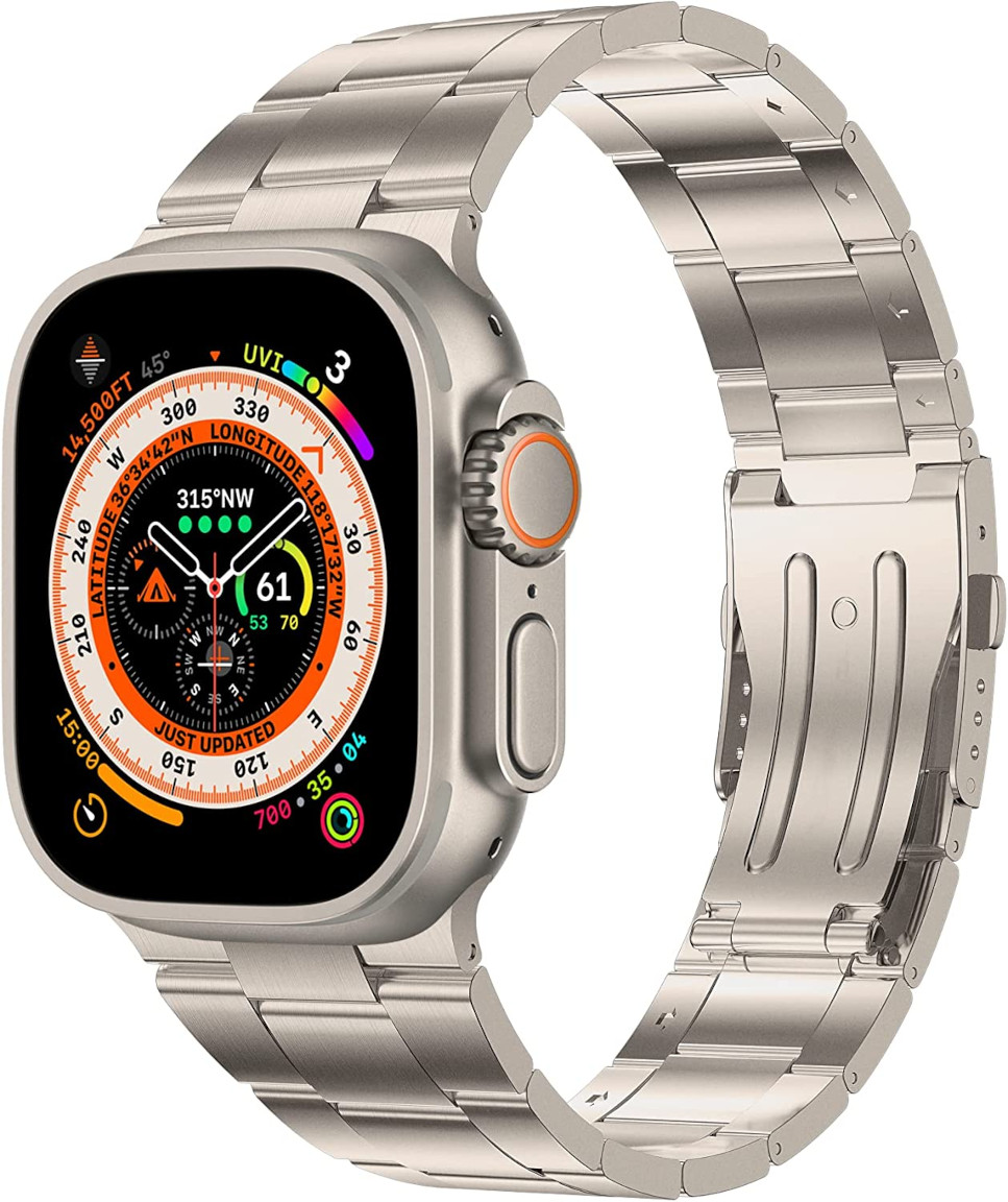 Tiera Apple Watch titaaniranneke hopea 49 mm rannekkeen kiinnitys tapahtuu titaanisella perhoslukolla ja ranneke on lyhennettävissä paloja irroittamalla. (HUOM! Pakkaus ei sisällä ranneketyökalua. Ranneketyökalu myydään erikseen). Päivitä Apple Watchiisi uusi ilme näyttävällä titaanirannekkeella. HUOM! Ranneke on tarvikeranneke ja se ei ole Applen valmistama!