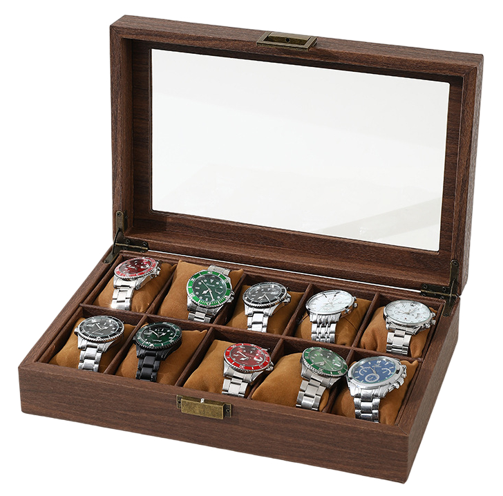 Tiera kellolaatikko 10 kellolle ruskea voit säilyttää laatikossa turvallisesti jopa 10 lempikelloasi. Laatikon sisäpinta on vaaleaa kangasta, joka suojaa kellojasi naarmuuntumiselta. Laatikon kantta suojaa ikkuna, josta näet helposti kaikki laatikossa olevat kellot. Tiera ruskea kellolaatikko on kooltaan 9 x 33 x 22 cm.