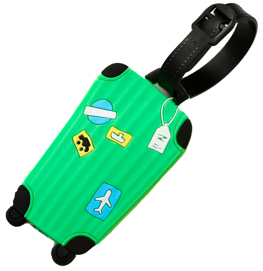 Tiera Green bag matkalaukkutagi on muotoiltu vedettäväksi matkalaukuksi, jossa on kiinni monta tarraa. Vihreä matkalaukkutagi on valmistettu muovista. Tagin saat helposti kiinnitettyä matkalaukkuusi ja näin yhteystietosi kulkevat aina matkalaukkusi mukana. Tagin kääntöpuolella on yhteystietokortti, johon voit täyttää nimesi, osoitteesi, puhelinnumerosi sekä sähköpostiosoitteesi.