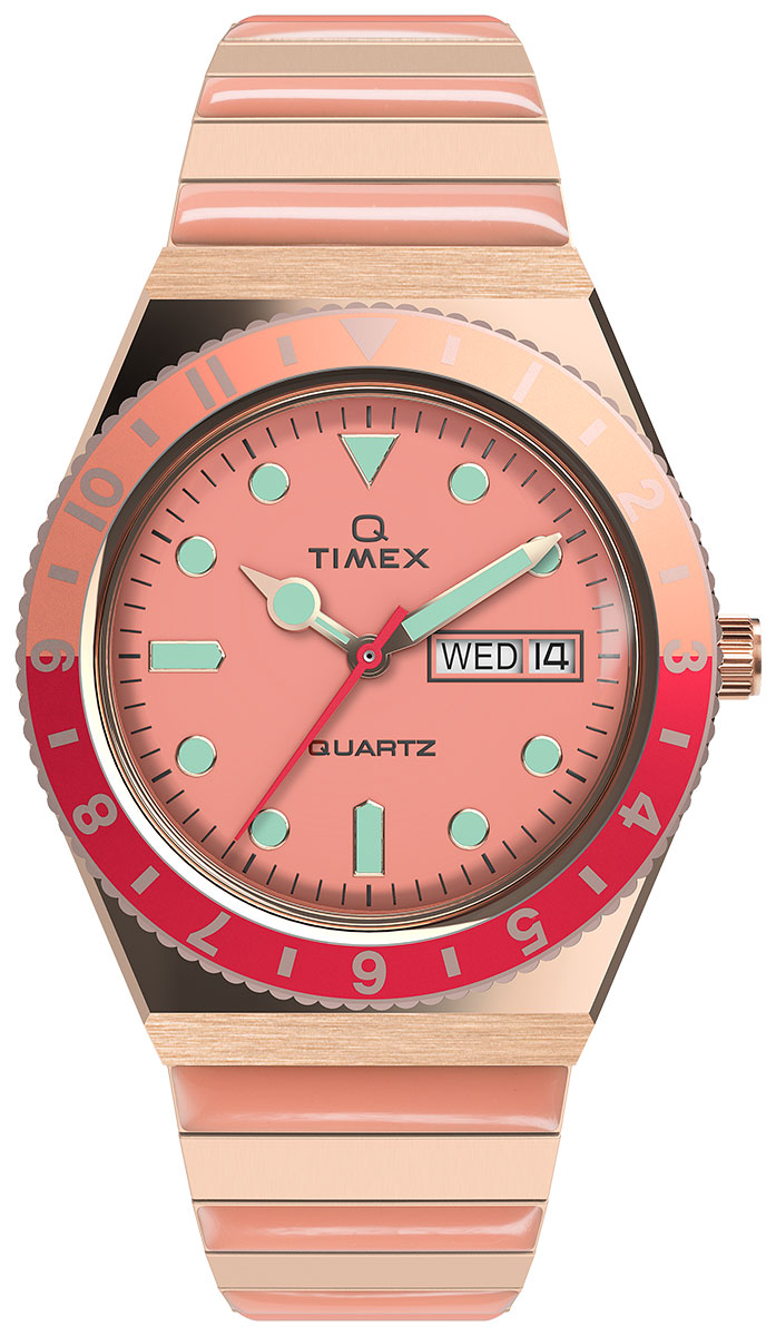 Timex Q Malibu TW2V38600 on upea monivärinen naisten kello, jonka 36 mm leveä ja 12 mm paksu runko on valmistettu ruusukullanvärisestä ruostumattomasta teräksestä. Tässä mallissa on vaaleanpunainen kellotaulu ja venyvä ruostumaton teräsranneke, jonka leveys kiinnityskohdasta on 16 mm. Kellolasi on akryylia. Q Timex Malibu TW2V38600 kuuluu vesitiiviysluokkaan 50 m / 5 atm, joten se on rajoitetusti vesitiivis (uintia ei suositella). Timex-rannekelloilla on kahden vuoden takuu ja ne toimitetaan valmistajan alkuperäisessä rasiassa.