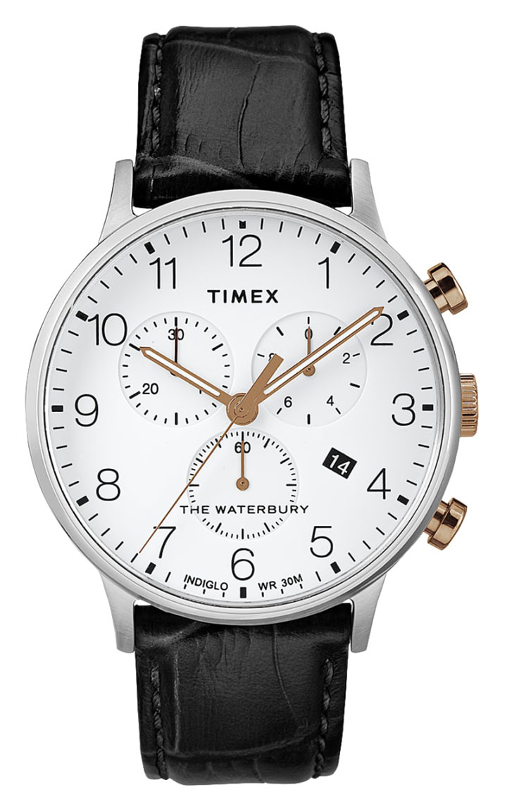 Timex Waterbury Classic Chronograph TW2R71700 on tyylikäs miesten kronografikello. Kellon 40 mm leveä ja 11 mm paksu runko on valmistettu mattamustasta ruostumattomasta teräksestä. Tyylikkään ulkonäön kruunaa musta nahkaranneke, jonka leveys kiinnityskohdasta on 20 mm. Valkoisesta kellotaulusta löytyy päivyri kello neljästä sekä pienemmät kellotaulut ajanottoa varten. Timex TW2R71700 -kellon INDIGLO®-valo-ominaisuus valaisee näytön myös pimeässä 3-4 sekunnin ajaksi, joten ajan lukeminen pimeässäkin onnistuu helposti. Voit myös asettaa päälle Night-tilan, jolloin saat näytön valaistua pelkällä napin painalluksella. Timex Waterbury TW2R71700 kuuluu 30 m -vesitiiviysluokkaan eli se on roiskevesitiivis. Timex-rannekelloilla on kahden vuoden takuu, ja ne toimitetaan valmistajan alkuperäisessä rasiassa.