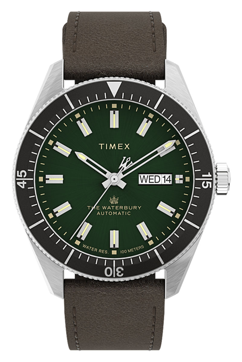 Timex Waterbury Dive Automatic TW2V24700 on tyylikäs sukelluskellon näköinen rannekello, jonka 40 mm leveä ja 13 mm paksu runko on valmistettu hopeanvärisestä ruostumattomasta teräksestä. Tässä mallissa on tummanvihreä kellotaulu ja tummanruskea nahkaranneke, jonka leveys kiinnityskohdasta on 20 mm. Kellon koneistona on 21-kivinen automaattikoneisto. Mineraalilasi suojaa kellotaulua, jossa päivyri viikonpäivänäytöllä. Timex Waterbury TW2V24700 kuuluu vesitiiviysluokkaan 100 m / 10 atm eli soveltuu pintauintikäyttöön ja snorkkelisukellukseen. Timex-rannekelloilla on kahden vuoden takuu ja ne toimitetaan valmistajan alkuperäisessä rasiassa.