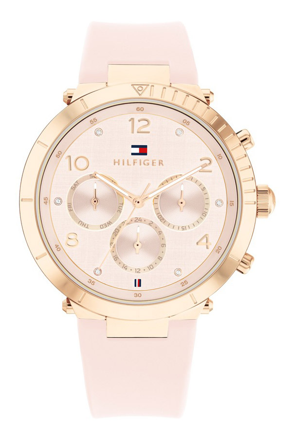 Tyylikäs Tommy Hilfiger -rannekello naisille, jotka arvostavat pehmeitä sävyjä ja modernia designia. Kellon rungon halkaisija on 38 mm, ja sen vaaleanpunainen kellotaulu hehkuu hillittyä naisellisuutta. Rungon punakultainen teräs tuo kelloon elegantin ja lämpimän sävyn, joka täydentää täydellisesti vaaleanpunaisen silikoni- rannekkeen raikkautta ja käyttömukavuutta. Kellon paksuus on 8,4 mm, joten se on miellyttävän kevyt ja sopivan siro ranteeseen. Kvartsikoneisto takaa tarkan ajanoton, ja mineraalilasi suojaa kellotaulua naarmuilta arjen haasteissa. Vesitiiviys 5 ATM tekee kellosta kestävän roiskeita ja satunnaista kastumista vastaan. Rannekkeen leveys 19 mm on täydellinen yhdistelmä tyylikkyyttä ja käytännöllisyyttä. Tämä kello sopii niin arkeen kuin vapaa-aikaankin – ajaton asuste, joka hurmaa vaaleanpunaisen ja punakullan sävyillään.