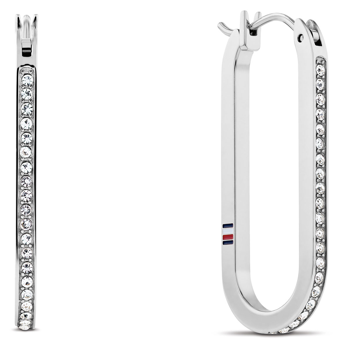 Tommy Hilfiger Dog Tag 2780865 -rengaskorvakorut on valmistettu ruostumattomasta teräksestä. Hopeanväriset ja ovaalinmuotoiset korvarenkaat ovat pituudeltaan 28 mm ja niihin on upotettu monta kirkasta zirkoniaa. Tommy Hilfiger -korut toimitetaan valmistajan alkuperäisessä rasiassa.
