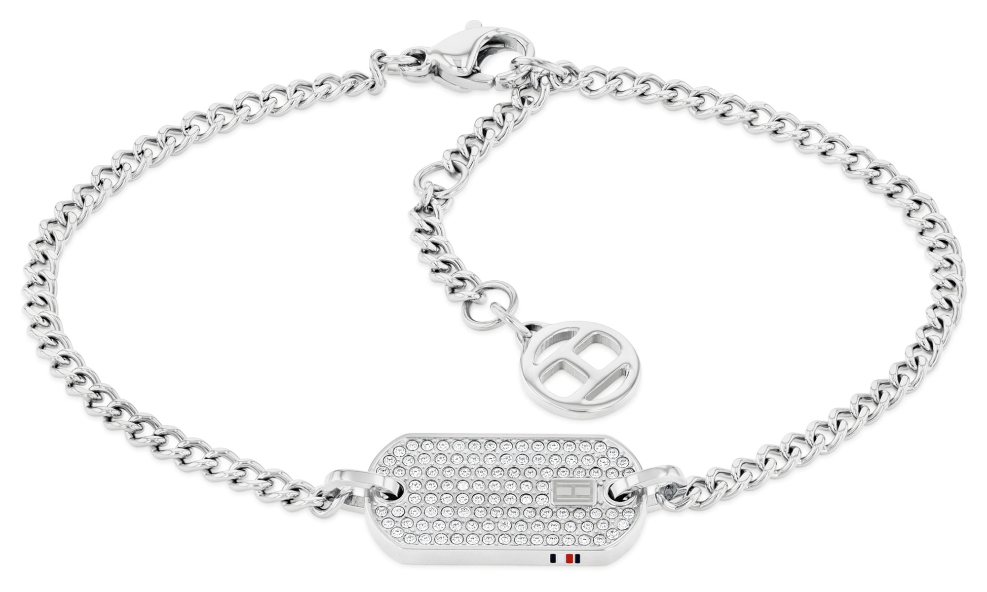 Tommy Hilfiger Dog Tag 2780863 -rannekoru on valmistettu ruostumattomasta teräksestä. Hopeanvärisen ranneketjun sisäympärysmitta on säädettävissä 16 - 19 cm. Ketjussa on dog tag-tunnuslevy, johon on upotettu monta kirkasta zirkoniaa. Ranneketjussa on papukaijalukko. Tommy Hilfiger -korut toimitetaan valmistajan alkuperäisessä rasiassa.