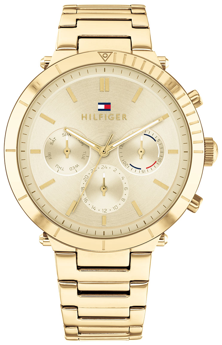 Tommy Hilfiger Emery 1782350 on tyylikäs naisten kello, jonka ruostumattomasta teräksestä valmistettu 38 mm leveä ja 10,25 mm paksu runko on kullanvärinen. Rannekkeena tässä mallissa on kullanvärinen ruostumaton teräsranneke, jonka leveys kiinnityskohdasta on 19 mm. Kellon ominaisuuksiin kuuluu multifunction ja päivyri. Tommy Hilfiger 1782350 -kellon kullanväristä kellotaulua suojaa mineraalilasi. Tommy Hilfiger -kelloille myönnetään 2 vuoden takuu ja ne toimitetaan valmistajan alkuperäisessä rasiassa.