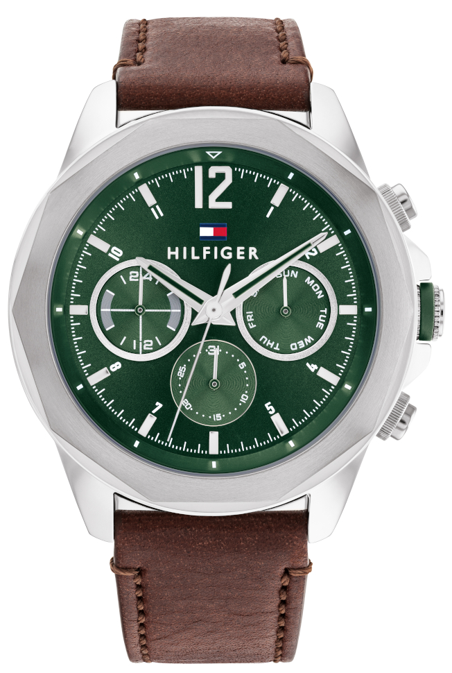 Kautta aikain ovat kulmikkailla bezeleillä varustetut kellot olleet halutuimpia ja tyylikkäimpiä kellomalleja markkinoilla. Tommy Hilfiger Lars brown-green 17920640-kellossa on yhdistetty tämä klassinen bezel-malli multifunction-toimintoon, ja kellon vihreä sunray-taulussa on perinteisen kellonaikanäytön lisäksi kolme erillistä näyttöä päivälle ja viikonpäivälle, sekä 24-tunnin kellolle. Tämä kello onkin loistava valinta vapaa-aikaan, ja sporttinen malli on varma valinta olit sitten matkalle harrastuksiin tai toimistolle. Ranneke on italialaista nahkaa. Tommy Hilfiger -kelloilla on 2 vuoden takuu, ja ne toimitetaan valmistajan alkuperäisessä rasiassa.