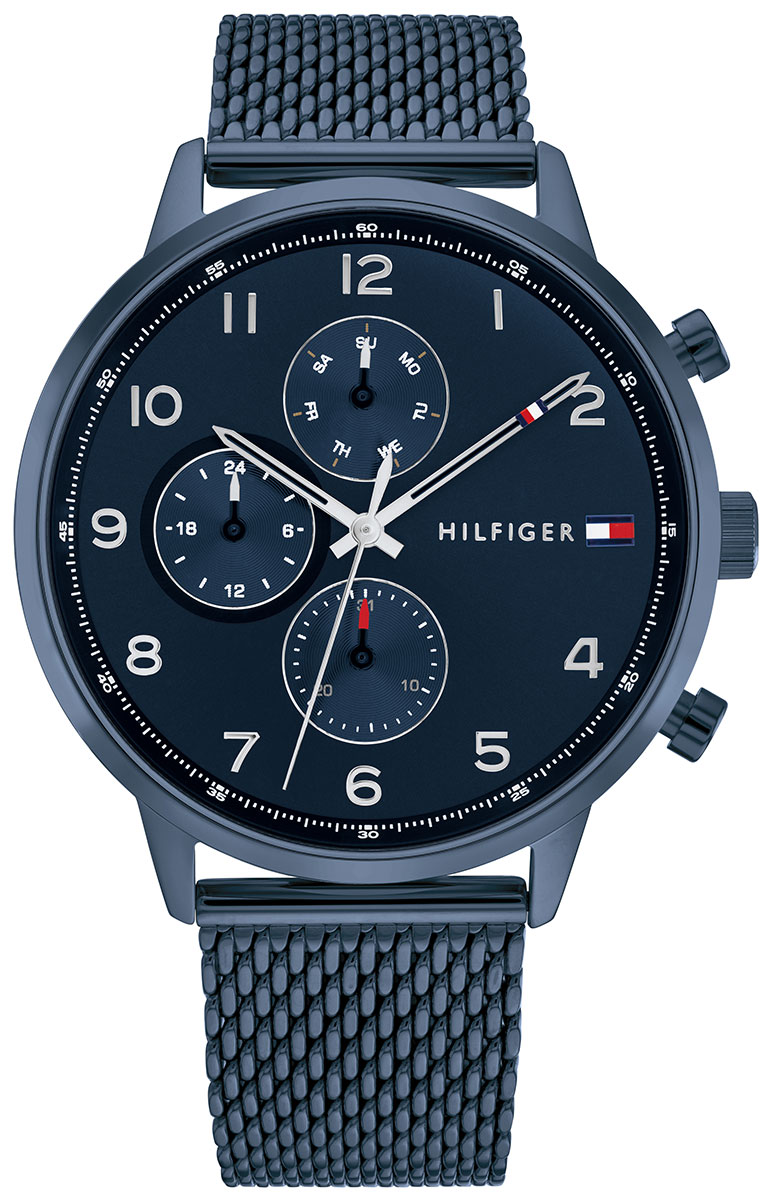 Tommy Hilfiger Leonard 1791990 on upea multifunktion-kello sinisellä väriteemalla. Kellotaulua suojaa naarmuuntumaton mineraalilasi, ja josta löytyy päivämäärä-, viikonpäivä- sekä tuntinäytöt. Runko on valmistettu ruostumattomasta teräksestä ja se on leveydeltään 44 mm ja paksuudeltaan 10,2 mm. Rannekkeena kellossa on sininen mesh-teräsranneke, jonka leveys kiinnityskohdasta on 21 mm. Kello kuuluu vesitiiviysluokkaan 50m / 5atm eli se on rajoitetusti vesitiivis (uintia ei suositella). Tommy Hilfiger -kellot toimitetaan valmistajan alkuperäisessä pakkauksessa ja niillä on kahden vuoden takuu.