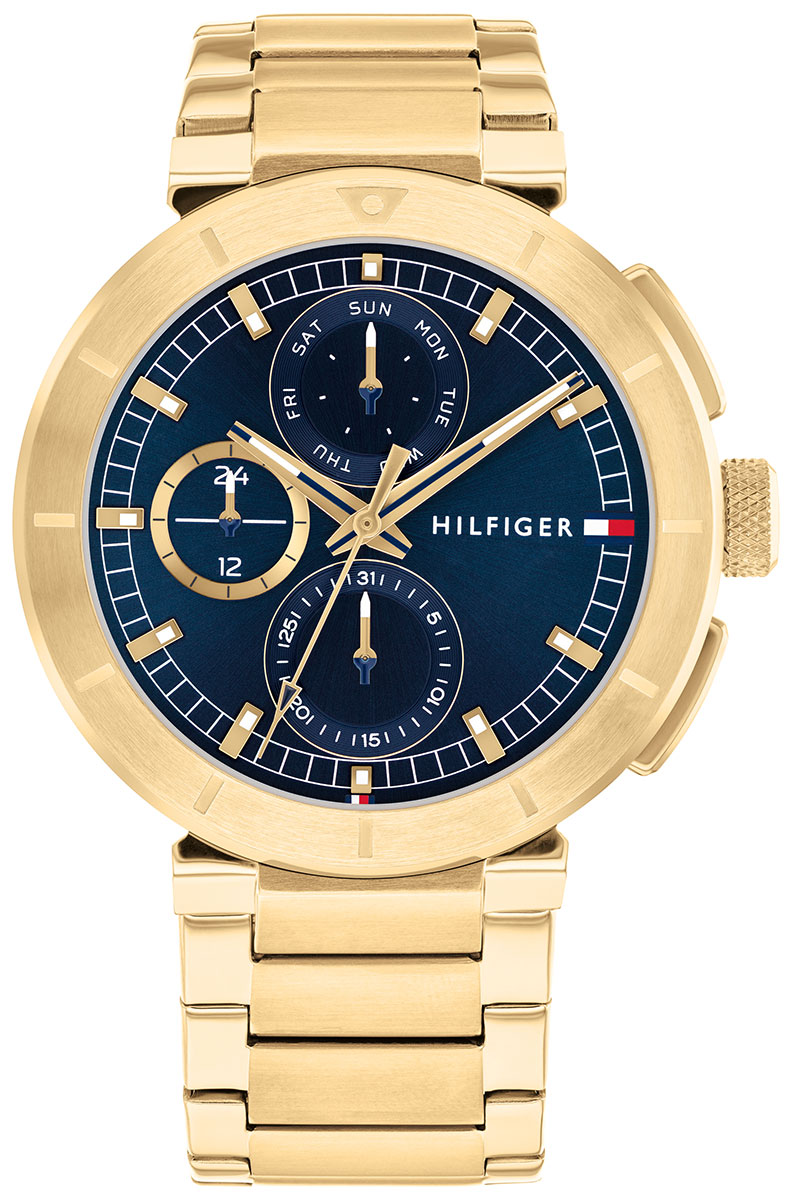Tommy Hilfiger Lorenzo 1792118 rannekellon mineraalilasilla varustetussa sinisessä kellotaulussa on selkeästi luettavat päivämäärä-, viikonpäivä- sekä tuntinäytöt ajan tarkkaa seuraamista varten. Osoittimet ja indeksit on luminoitu, eli ajan seuraaminen onnistuu pimeälläkin. Kullanvärinen runko on valmistettu ruostumattomasta teräksestä ja se on leveydeltään 44 mm ja paksuudeltaan 10,7 mm. Rannekkeena kellossa on ruostumaton teräsranneke, jonka pituus on 160 - 210 mm ja leveys kiinnityskohdasta 14 mm. Kello kuuluu vesitiiviysluokkaan 50m / 5atm eli se on rajoitetusti vesitiivis (uintia ei suositella). Tommy Hilfiger -kellot toimitetaan valmistajan alkuperäisessä pakkauksessa ja niillä on kahden vuoden takuu.
