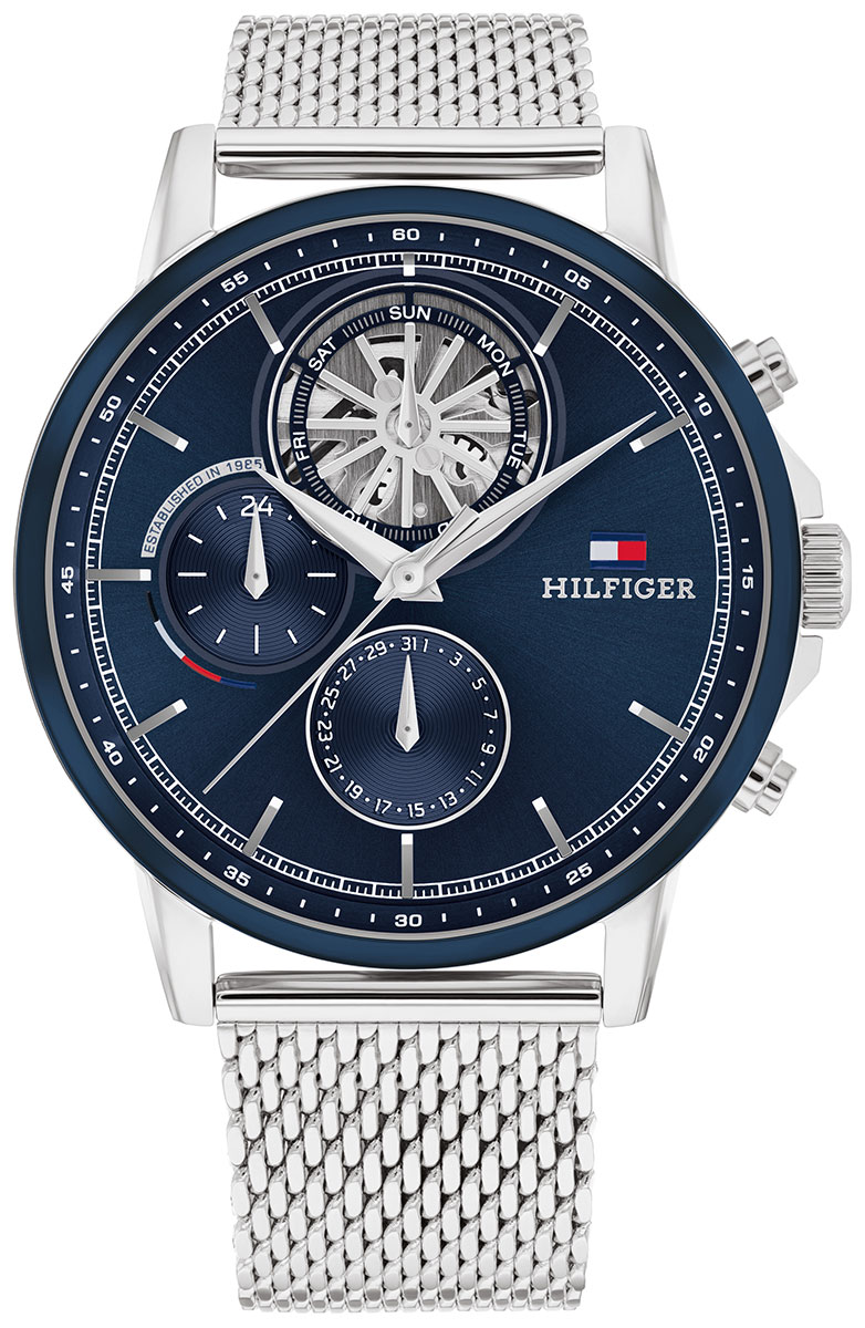 Tommy Hilfiger Stewart 1710609 rannekellon sinistä Open Heart -kellotaulua suojaa naarmuuntumaton mineraalilasi, josta löytyy päivämäärä-, viikonpäivä- sekä tuntinäytöt. Kellon runko on valmistettu ruostumattomasta teräksestä ja se on leveydeltään 44 mm ja paksuudeltaan 11,9 mm. Rannekkeena kellossa on teräksinen mesh-ranneke, jonka pituus on 160 - 210 mm ja leveys kiinnityskohdasta 22 mm. Kello kuuluu vesitiiviysluokkaan 50m / 5atm eli se on rajoitetusti vesitiivis (uintia ei suositella). Tommy Hilfiger -kellot toimitetaan valmistajan alkuperäisessä pakkauksessa ja niillä on kahden vuoden takuu.