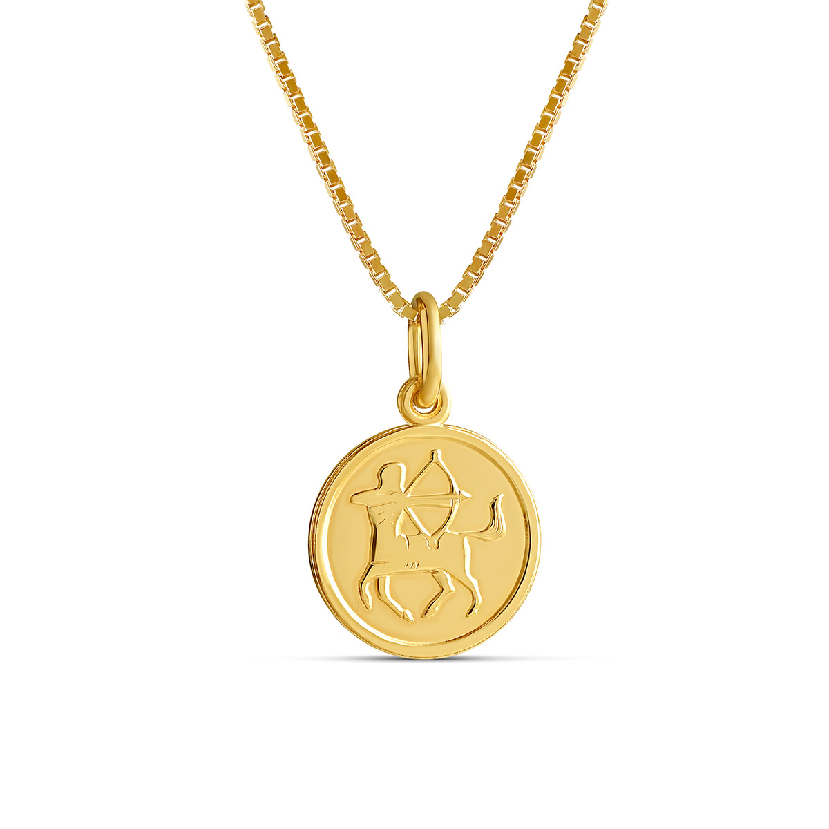 Top Goldin tyylikäs ja ajaton Jousimies-horoskooppiriipus on kaunis tapa tuoda esiin omaa persoonallisuutta tai ilahduttaa lahjana. Riipuksessa on hienostunut Jousimiehen symboli, joka on toteutettu tarkasti viimeisteltyyn pyöreään muotoon. Riipuksen koko on 11,5 mm. Kullattu pinta antaa korulle lämpimän ja ylellisen sävyn.