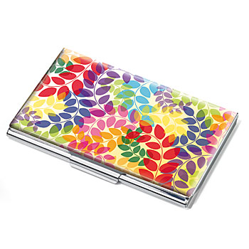 Troika CDC10-A084 Colorful Leaves korttikotelo on valmistettu ruostumattomasta teräksestä, ja sen pintään on kiinnitetty värikkäitä lehtiä kuvastava tarra. Korttikotelo on yksinkertaisen näppärä käyttää ja sen ulkomitat ovat: 99 x 59 x 6 mm.