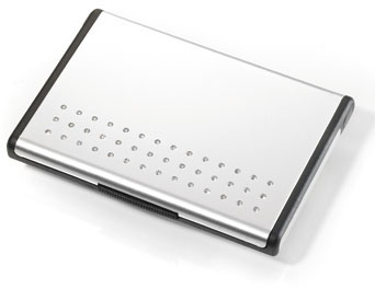 Troika korttikotelo. Sopii erityisen hyvin käyntikorteille. Avaamalla korttikotelon pöydällä se automaattisesti muuntautuu käyntikortti telineeksi. Materiaali Alumiini.