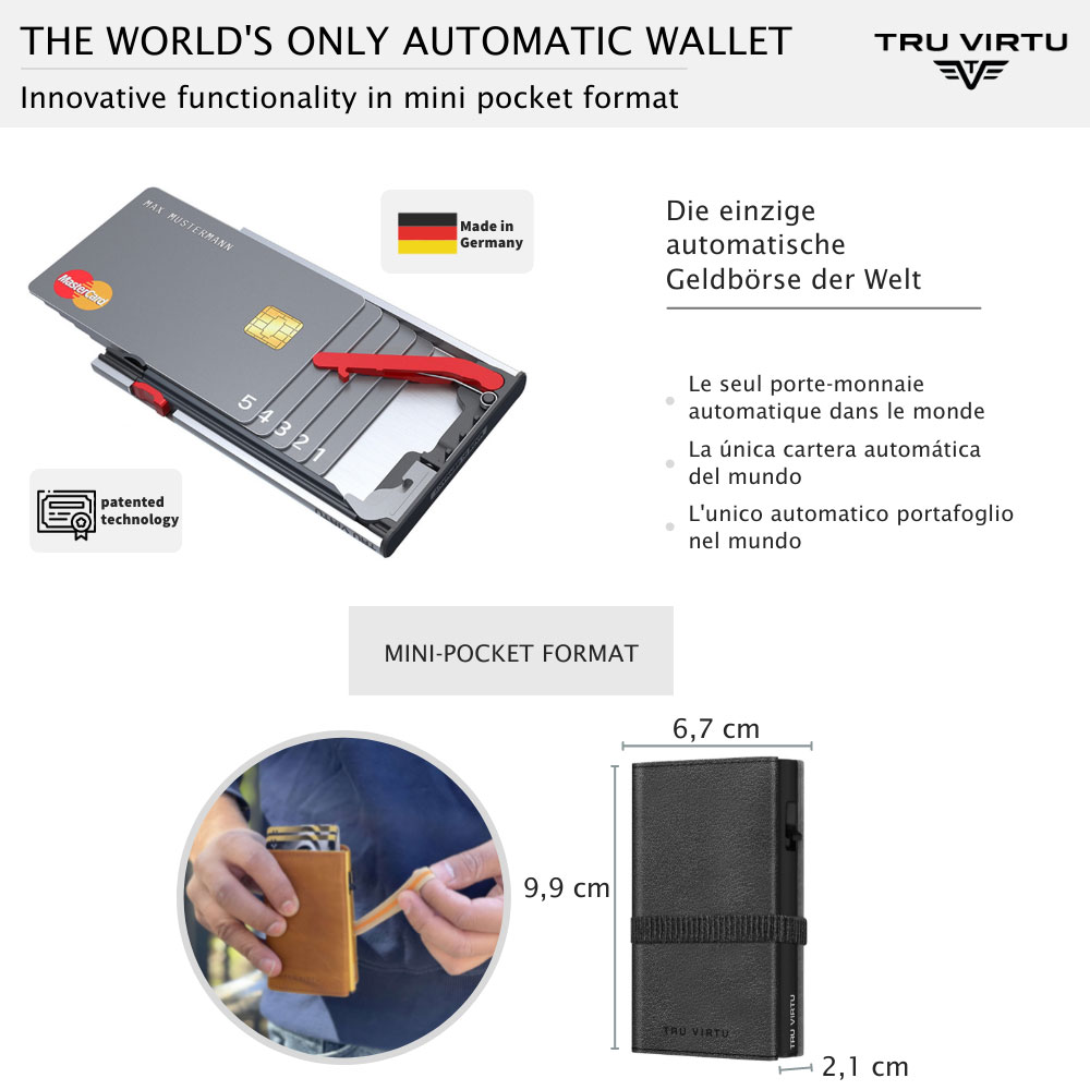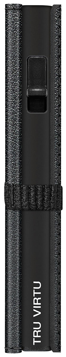 Tru Virtu Click & Slide Strap Cross Nappa Black on RFID-suojattu korttikotelo, joka on valmistettu alumiinista ja laadukkaasta italialaisesta nahasta. Tru Virtu Click & Slide Strap Cross Nappa Black -lompakoissa käytetään innovatiivista ja patentoitua "Click & Slide" -teknologiaa. Peukalon työnnöllä korttisi pomppaavat ulos alumiinikotelosta porrastetusti ja saat kätevästi poimittua oikean kortin. Alumiinikotelo suojaa kortteja myös etäluennalta. Lompakko on kiedottu italialaiseen nahkaan, joka aukeaa napin avauksella seteli- ja korttitaskuksi, joten myös setelit ja kuitit kulkevat kätevästi mukana. Lompakko on kooltaan 99 x 67 x 19 mm. Alumiinikoteloon mahtuu 5 korttia ja avautuvaan nahkataskuun saat mahtumaan jopa 7 korttia lisää sekä seteleitä.