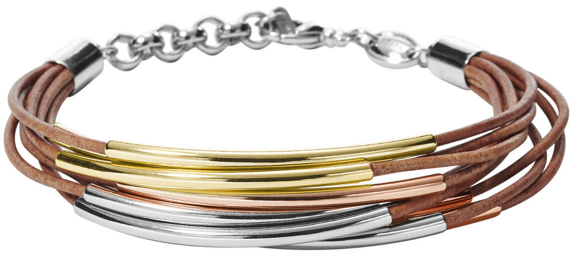 Fossil JA6694998 -rannekorussa yhdistyy yhdeksän nauhaa ja ruostumaton teräs luodakseen lyömättömän lookin. Ranneke on valmistettu ruskeasta aidosta nahasta ja liitekohdat ovat hopeista, punakultaista ja kultaista ruostumattomasta teräksestä valmistettuja. Rannekorussa on papukaijalukitus jolla voit hienosäätää korun pituutta. Korun pituus on säädettävissä välillä 18-21cm. Fossil -korut toimitetaan valmistajan alkuperäisessä pakkauksessa.