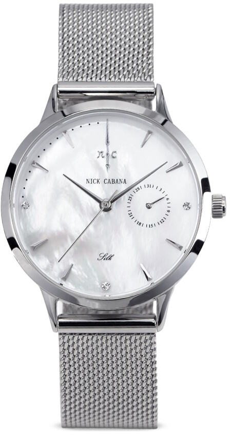 Nick Cabana Nilaya Silk NC211 -kellossa säihkyy silkkisenpehmeä väriskaala. Kellon runko ja ranneke on valmistettu hopeanvärisestä ruostumattomasta teräksestä. Kellosta uniikin tekee sen silkkivärein kiiltävä kellotaulu jota on koristeltu kristallein. Ominaisuutena kellosta löytyy myös päivyri. Kellon rungon leveys on 34.3mm ja paksuus 8.1mm. Rannekkeen leveys kiinnityskohdasta on 16mm. Nick Cabana -kelloille myönnetään 2 vuoden takuu ja ne toimitetaan valmistajan alkuperäisessä rasiassa. Voimme kaivertaa veloituksetta kellon takakanteen esimerkiksi nimikirjaimet ja päivämäärän (maksimissaan 10 merkkiä). Valitse ensin kaiverrus ja kaiverruksessa käytettävä tekstityyli ja kirjoita kaiverrettavat tiedot "kaiverrettava teksti" -kenttään. Huom! Kaiverretuilla tuotteilla ei ole palautusoikeutta!