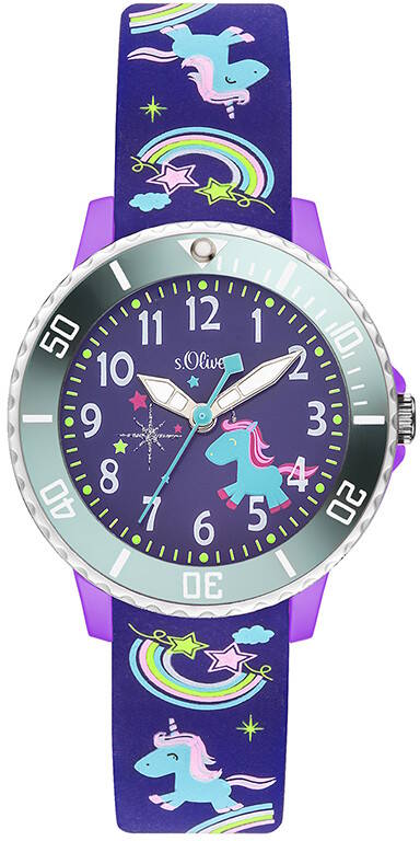 S.Oliver SO-3434-PQ -kello on purppuravärin ja ponien fanin paras ystävä! Silikonista valmistettu purppuranvärinen ranneke on miellyttävä ranteessa ja se on kuvioitu ponein ja sateenkaarein. Kellon rungon leveys on 30.8mm ja paksuus 9.5mm. Rannekkeen leveys kiinnityskohdasta on 13.8mm. S.Oliver -kelloille myönnetään 2 vuoden takuu ja ne toimitetaan valmistajan alkuperäisessä rasiassa. Voimme kaivertaa veloituksetta kellon takakanteen esimerkiksi nimikirjaimet ja päivämäärän (maksimissaan 15 merkkiä). Valitse ensin kaiverrus ja kaiverruksessa käytettävä tekstityyli ja kirjoita kaiverrettavat tiedot "kaiverrettava teksti" -kenttään. Huom! Kaiverretuilla tuotteilla ei ole palautusoikeutta!