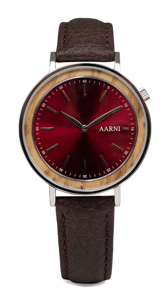 Aarni Aurora Oliivipuu on siro ja elegantti rannekello, joka koonsa puolesta sopii parhaiten naisille. Kellon 36 mm leveä runko on valmistettu ruostumattomasta teräksestä. Tiikkipuinen kehys ja räväkkä burgundinpunainen kellotaulu antavat kellolle tyylikkään ulkonäön. Kellotaulua suojaa mineraalilasi. Kellon ilmeen kruunaa aidosta kotimaisesta hirvennahasta valmistettu ruskea nahkaranneke. Rannekkeen leveys on kiinnityskohdasta 16 mm. Kello sopii suoraan 13-18,5 cm kokoiseen ranteeseen. Kellon sydämenä on japanilainen Miyota 2025 -kvartsikoneisto. Kello kuuluu 3 ATM -vesitiiveysluokkaan eli se on roiskevesitiivis.