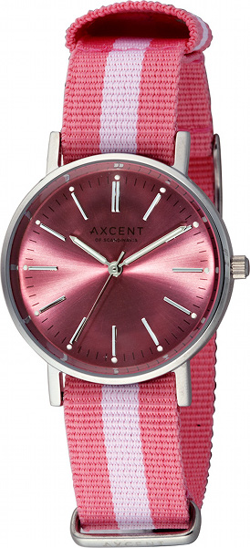 Axcent Vintage X78004-15 söpöllä vaaleanpunaisella kellotaululla. Kellon runko on valmistettu ruostumattomasta teräksestä ja sen leveys on 36mm. Kauniin vaaleanpuna-valkoraitaisen kangasrannekkeen leveys on 18mm. Axcent kelloille myönnetään 2 vuoden takuu ja ne toimitetaan valmistajan alkuperäisessä rasiassa.