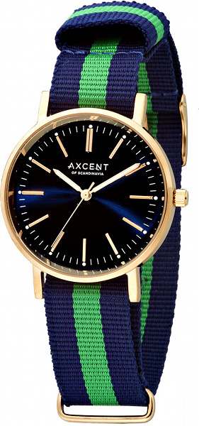 Axcent Vintage X7800R-21 rannekellossa on tyylikäs vihreä-sini-raidallinen kangasranneke ja punakullanvärinen runko sekä indeksit. Kellon runko on valmistettu ruostumattomasta teräksestä ja sen leveys on 36mm. Muodikkaan ja värikkään kangasrannekkeen leveys on 18mm. Axcent kelloille myönnetään 2 vuoden takuu ja ne toimitetaan valmistajan alkuperäisessä rasiassa.